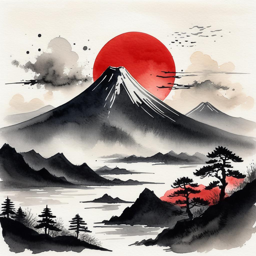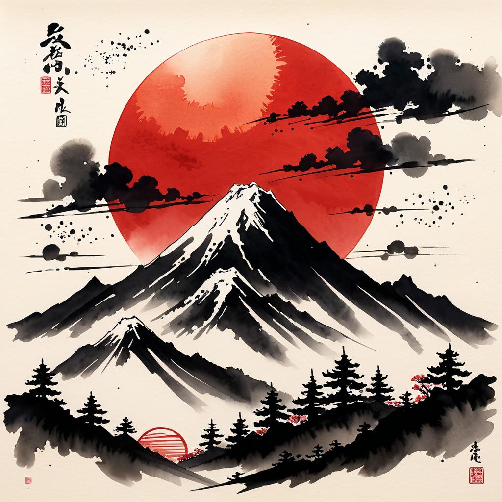 Traditional Japanese Ink Wash Mountain with Red Sun