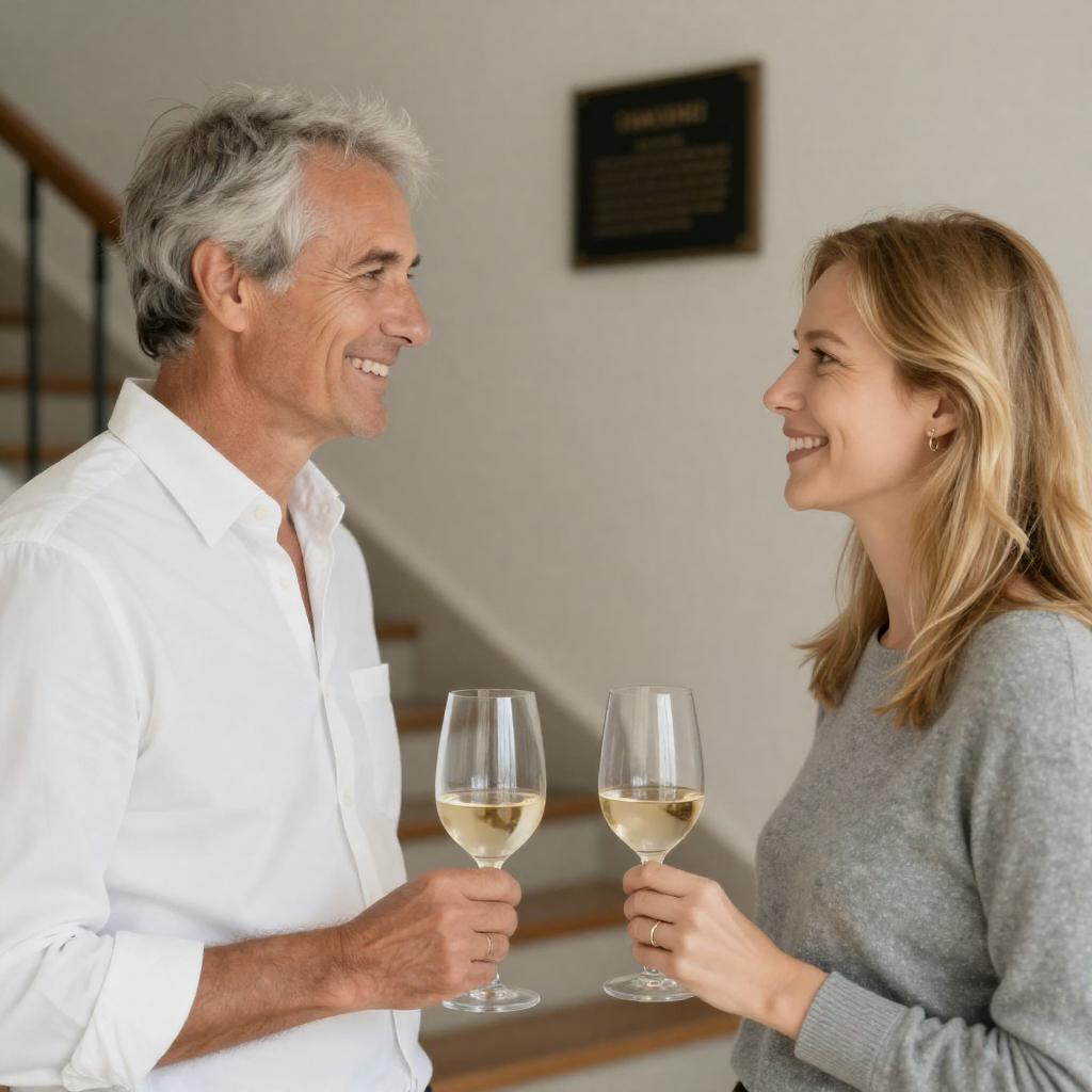 Photograph of a man and woman in an office setting. Woman with blonde hair, smiling, pours wine into man's hand. Man with short gray hair, serious expression, wears white shirt and black tie. Blurred window blinds in background.