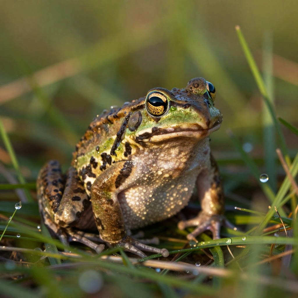 Real frog standing up looking curious, surrounded by tall grass and dew drops, early morning light casting soft shadows, sharp focus on frog with realistic textures