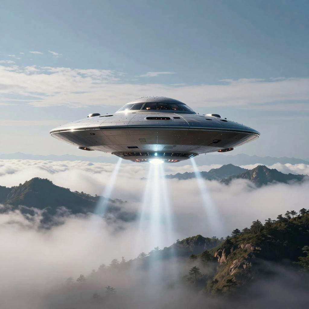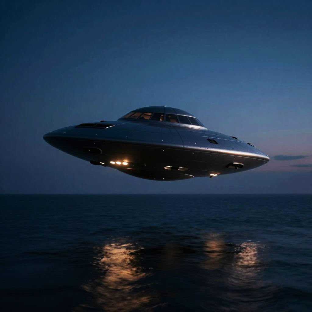 Night scene with a cigar shape UFO silently cruising over a calm ocean, glowing lights on its side illuminating the water below, sleek design with smooth metallic texture