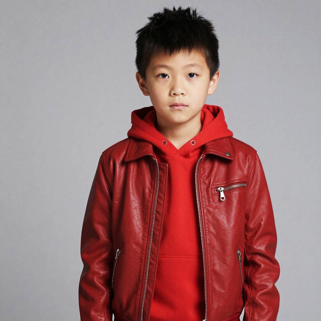 Portrait of an Asian young boy with short black hair wearing a bright red leather jacket over a red hoodie, standing against a plain grey background. The boy has a calm, neutral expression.