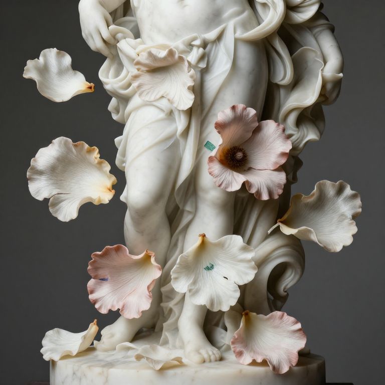 A highly intricate, detailed Rococo marble sculpture featuring floating, enlarged flower petals made by silk setting collage painting, reminiscent of Bronzino's style.