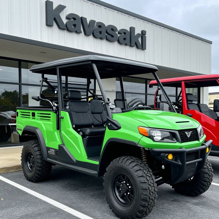 Vibrant green 2021 Kawasaki Teryx4 LE parked prominently in front of a commercial building in Statesville, North Carolina, showcasing its rugged design and open-air cabin with a matching red utility vehicle visible in the background.