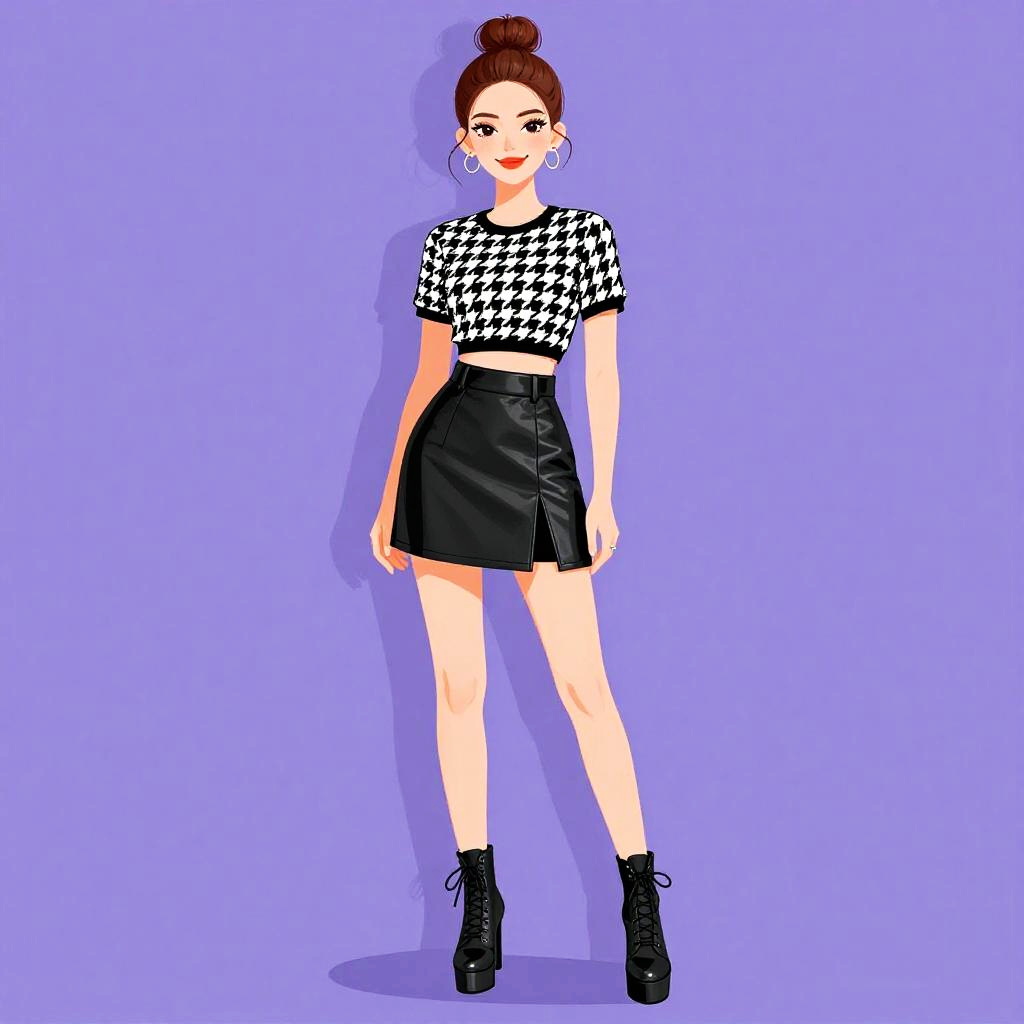 Woman with pretty face and pretty hair. Woman, contemporary street style, black off-the-shoulder crop top with puff sleeves, houndstooth patterned wrap mini skirt with an asymmetrical hem, yellow slide sandals, white backdrop. --sref 1467
