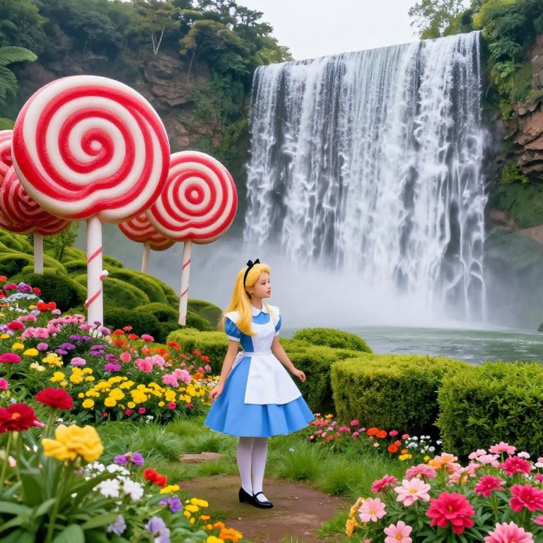 A vibrant digital illustration features a blonde Alice in Wonderland character in a blue and white dress, white stockings, and black shoes, standing in a colorful flower garden. Behind her, towering red and white swirl-patterned lollipops rise beside a cascading waterfall surrounded by lush greenery. The garden is filled with bright yellow, red, pink, and white flowers, creating a whimsical, fantastical scene. The image has a fairy tale-like quality with vivid colors and detailed textures.