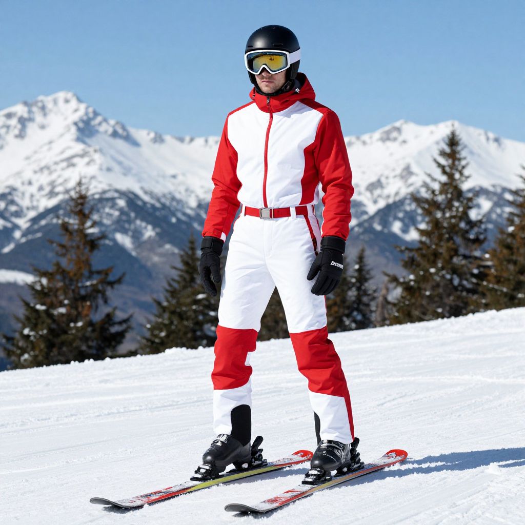 Ski Costume, skier in red and white outfit standing in snow with ski goggles on