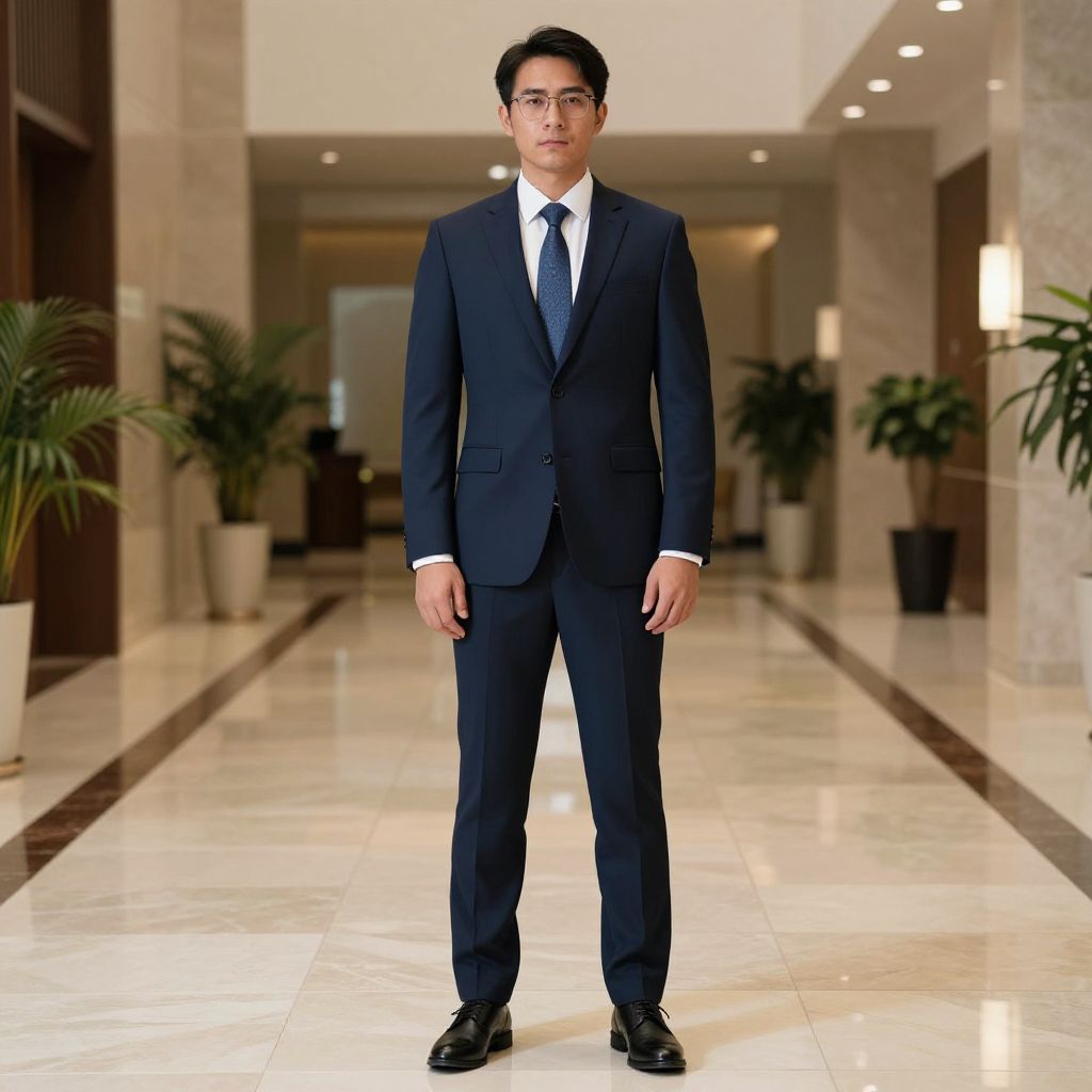 Photograph of an Asian man standing in a luxurious, well-lit hallway with polished marble floors and cream-colored walls. He has short black hair, wears glasses, and is dressed in a dark navy blue suit with a white shirt and black tie. His expression is neutral, and he stands with his arms relaxed by his sides. The hallway features potted plants and recessed lighting. The background includes a blurred view of the hallway extending into the distance. His black leather shoes are shiny and polished. The overall atmosphere is professional and elegant.