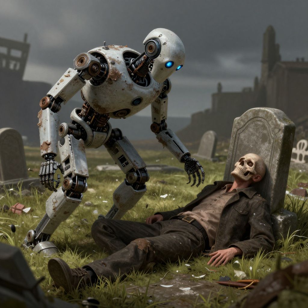 A broken robot in dirty, tattered tatters summons a dead man from the land, graveyard, highly detailed, digital painting, artstation, sharp focus, illustration,