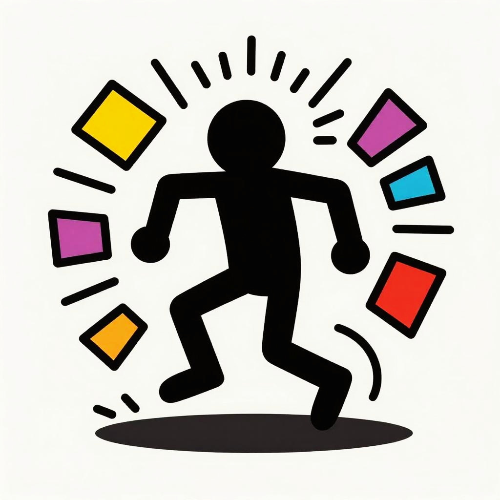 Keith Haring stick figure in dynamic motion, surrounded by radiant geometric shapes and colorful bursts, set against a bright, textured background, iconic street art inspired composition