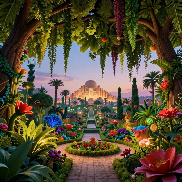 Voice Acting the hanging gardens of babylon, masterpiece, 8k, vibrant, lush dynamic lighting, city of bablyon in background, evening,