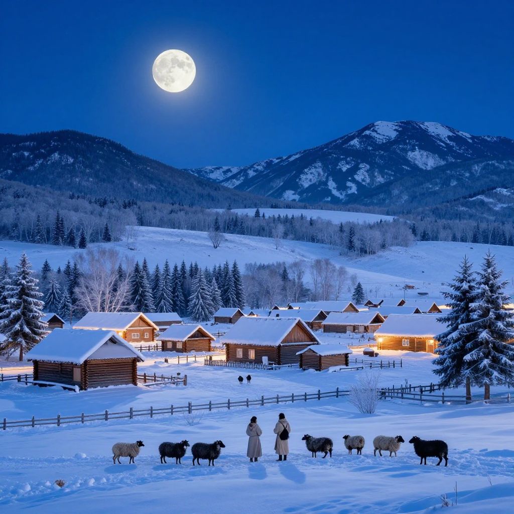 A mystical winter village scene during the solstice, featuring snow-covered wooden cottages nestled in frosted hills. The glowing full moon illuminates the landscape, with shepherd figures watching over dark-colored sheep and dogs. Pine trees and mountain peaks frame the snowy valley setting under a clear starry night sky.