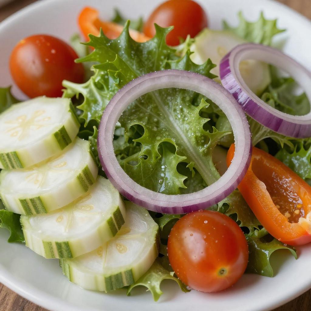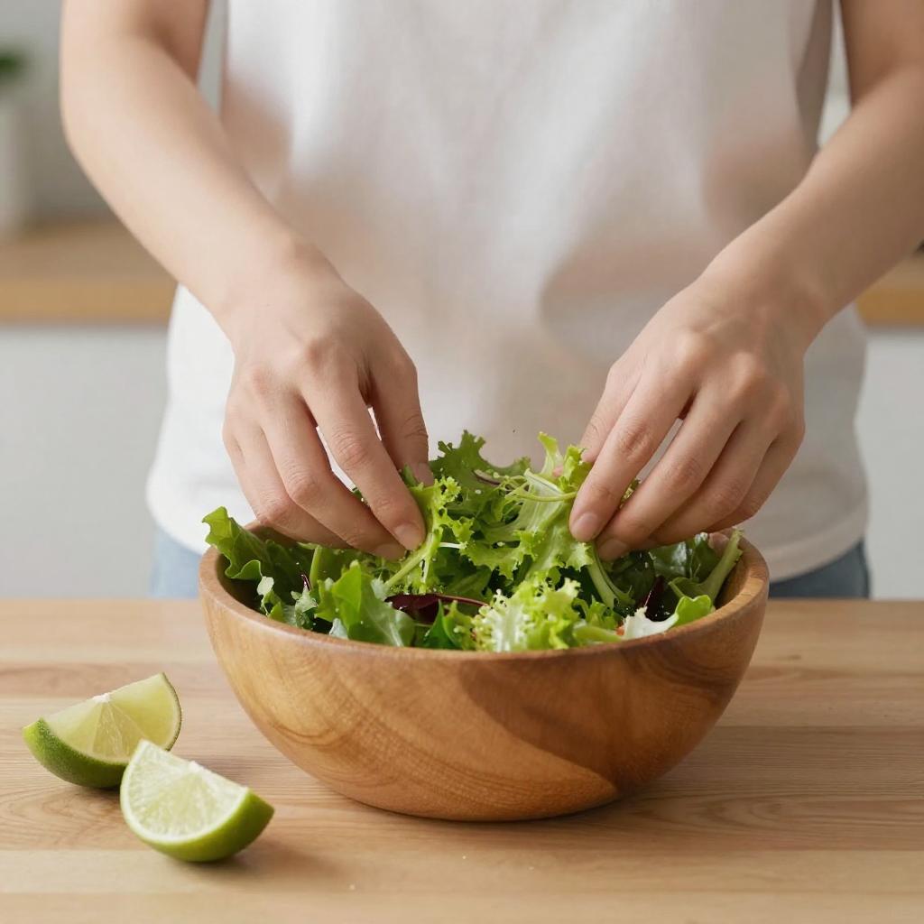 Photograph of a person's torso, wearing a white sleeveless top, preparing a fresh green salad in a wooden bowl on a light wooden table. The person is gently tossing the salad with their hands. Two lime wedges and some lettuce are on the table. Bright, even lighting. Shot from a slight low angle, shallow depth of field with a blurred background.