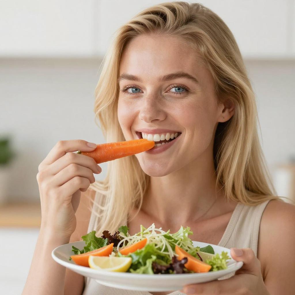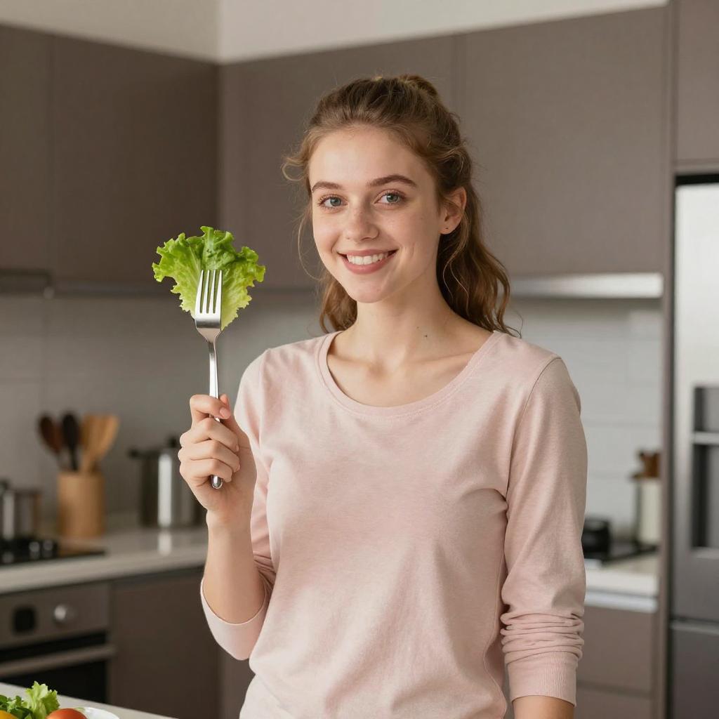 Close-up shot of a person wearing a white sleeveless top tossing fresh green salad leaves in a wooden bowl on a light wooden table. Two lime wedges are placed next to the bowl. The image is brightly lit with a shallow depth of field and blurred background.