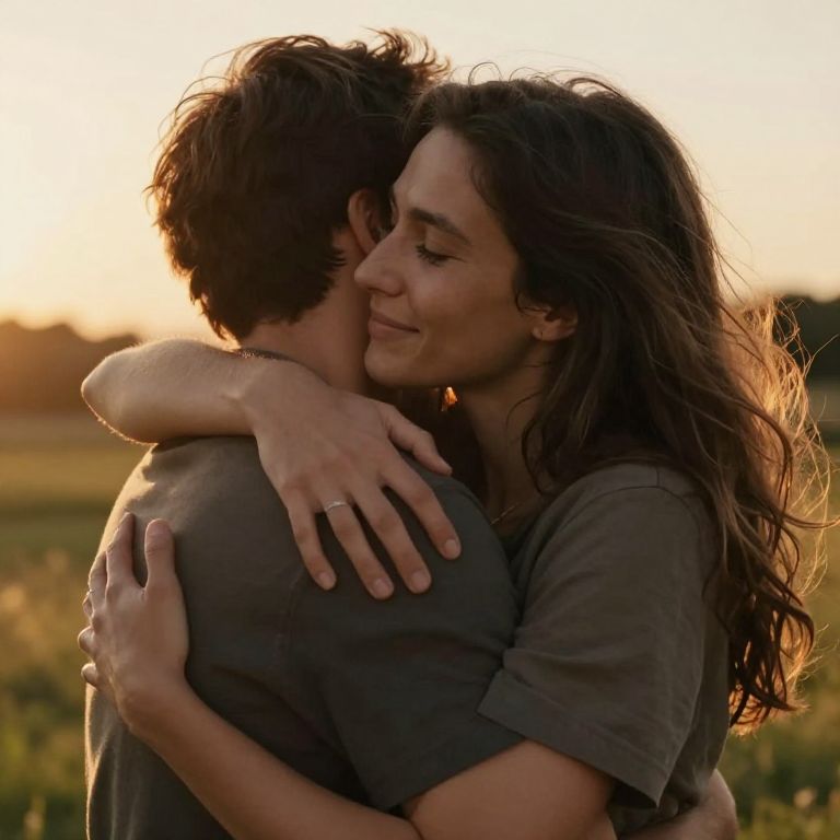 A candid shot of a couple in their 30s sharing a heartfelt embrace, their faces illuminated by the golden hour sunlight, showing deep emotion and love through their body language