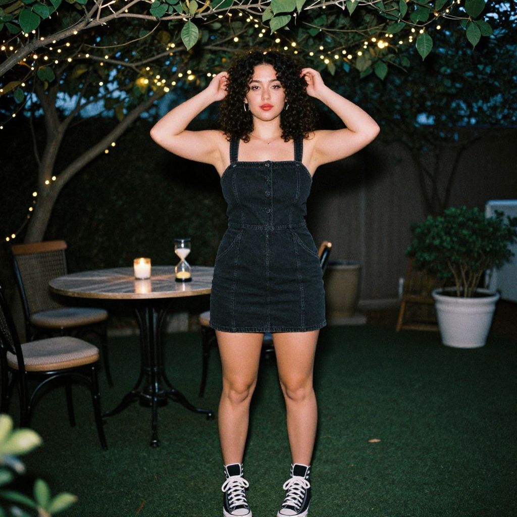 A Hourglass woman in casual streetwear, wearing a black denim mini overall dress with a square neckline and high-top sneakers, stands under string lights in a cozy garden, playfully adjusting her curly hair while enjoying a warm evening. The scene is captured in the style of Eastman reversal film stock. Sexy. Pretty face and beаutiful eyes. Big breasts