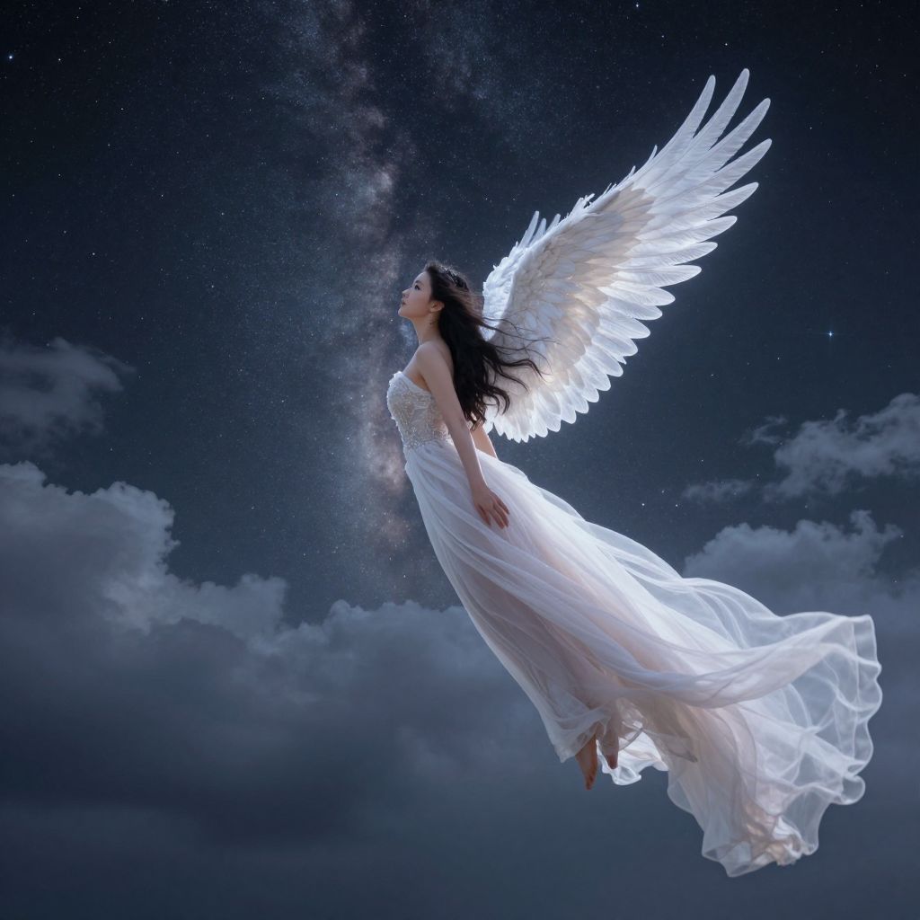 Photograph of a serene, ethereal angelic woman with glowing white wings and flowing white dress, floating against a starry night sky with cloudy background