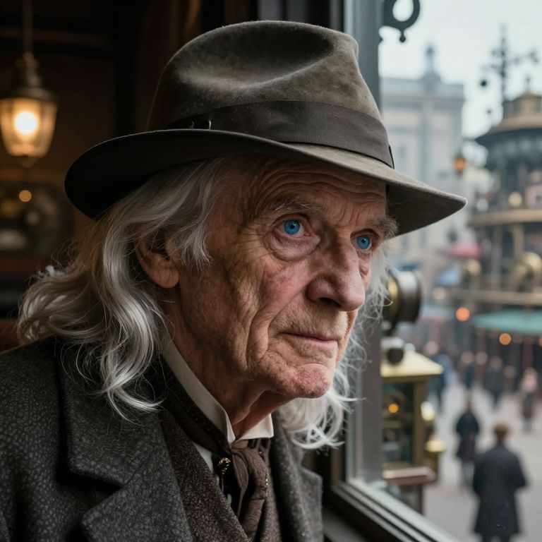 Craft a highly detailed photorealistic portrait photograph of an elderly time traveler with a face weathered by time and long silver hair framing their features. Their docile blue eyes, filled with wisdom and intrigue, peer from beneath the shadow of a worn fedora, creating a soft contrast against their skin. Position this character in an unusual perspective, leaning slightly out of a vintage window, as bustling steampunk-inspired city life unfolds behind them, blending technology and Victorian aesthetics to evoke nostalgia and anticipation for the unknown future.