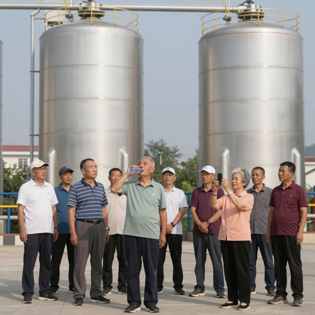 Photograph of a crowded outdoor scene with a large group of men wearing hats and coats, standing in rows. Front row men look forward, middle row men look to the side, background people raise hands. Bright lighting, autumn foliage.