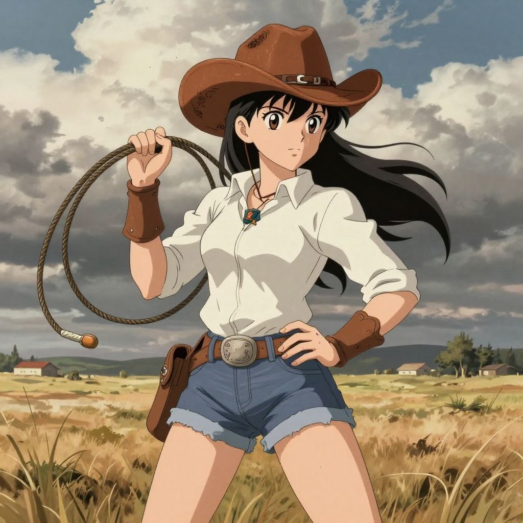 Anime girl cowboy hat, holding a lasso in an open prairie, dramatic clouds overhead, intricate shading on hat and clothes, earthy tones, energetic and confident stance