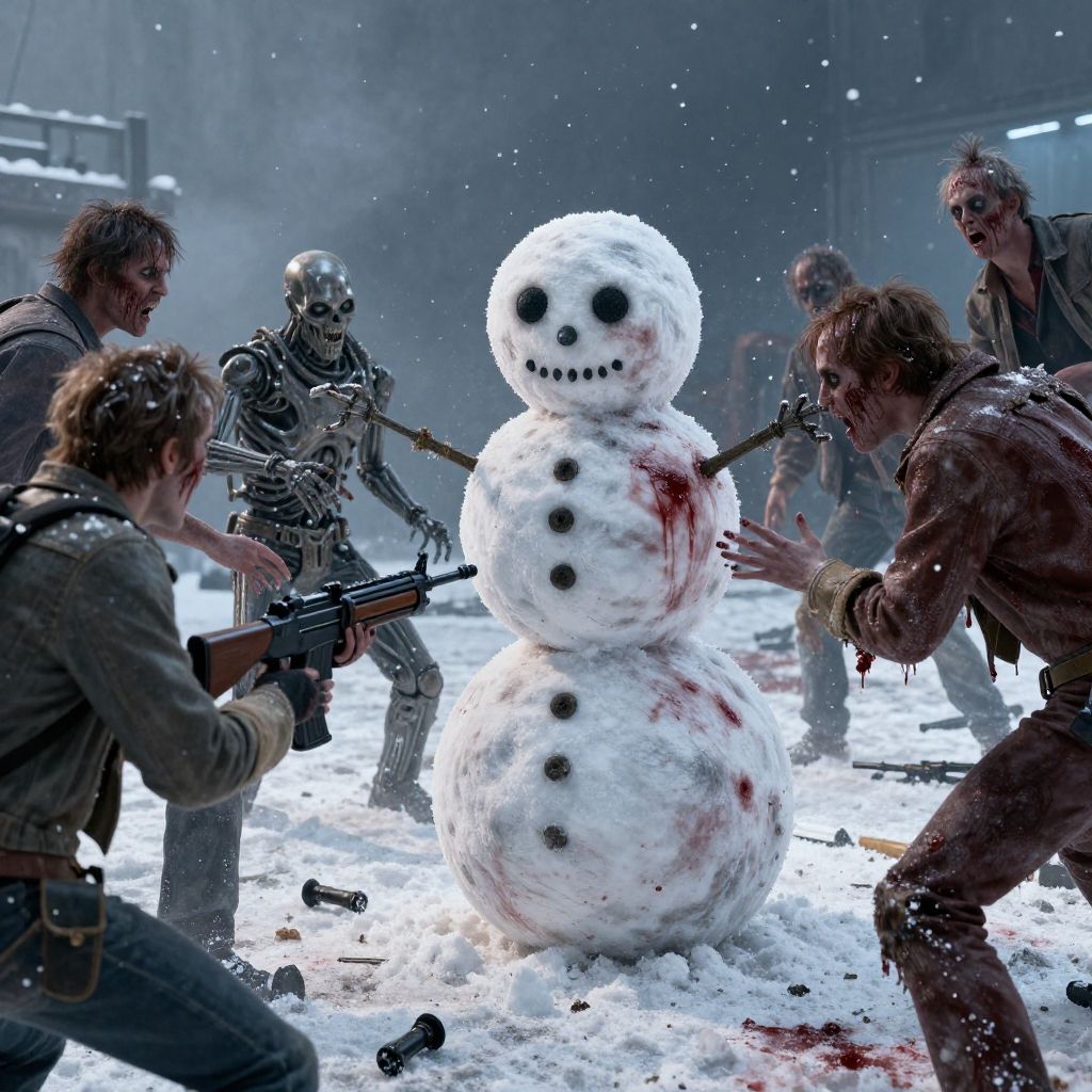 Photograph in a hyper-realistic style depicting a snowy battlefield scene. Five disheveled, armed, zombie-like individuals with tattered clothing and blood-stained faces surround a large, three-tiered snowman with black coal eyes and a blood-stained, smiling mouth. One zombie in a skeleton costume stands in the center, holding a rifle aimed at the snowman. Snow and blood are scattered on the ground, with a dark, industrial building in the misty background. The zombies have a mix of human and decayed features, adding to the eerie, post-apocalyptic atmosphere. The snowman's presence contrasts sharply with the violent scene surrounding it.