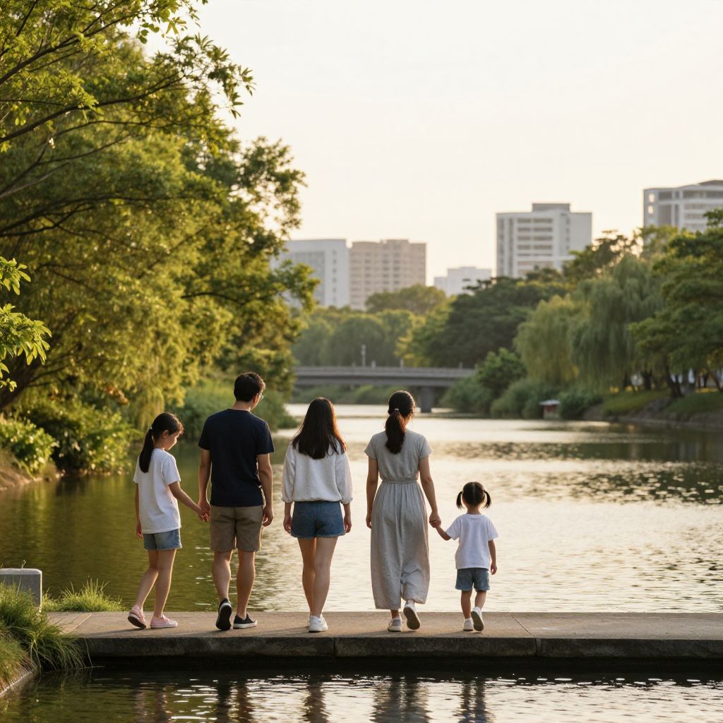 Four individuals—a man, a woman, and two children—walk hand-in-hand along a tranquil waterway, surrounded by lush greenery and modern cityscapes bathed in the warm glow of a setting sun.