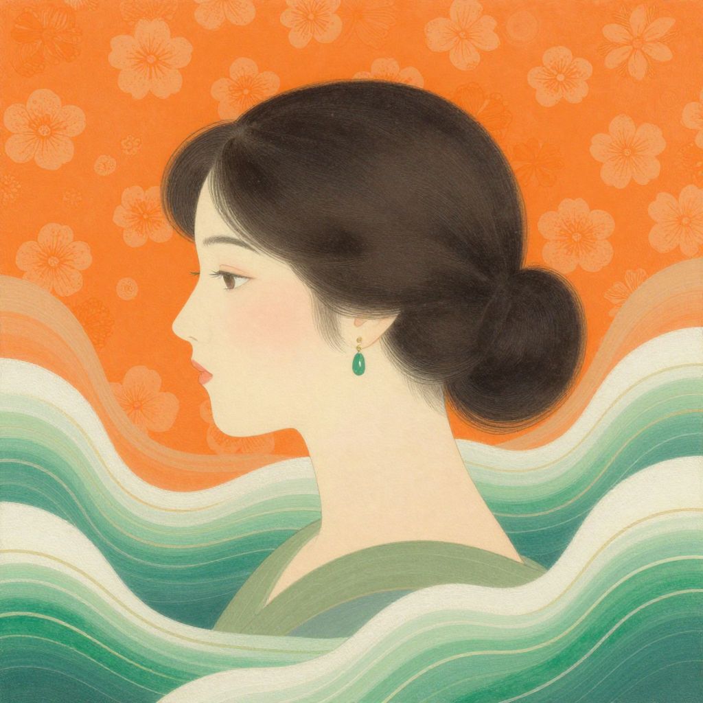 Digital illustration of a serene Asian woman with dark hair in an elegant bun, golden earrings, against an orange floral background, surrounded by green and white wave