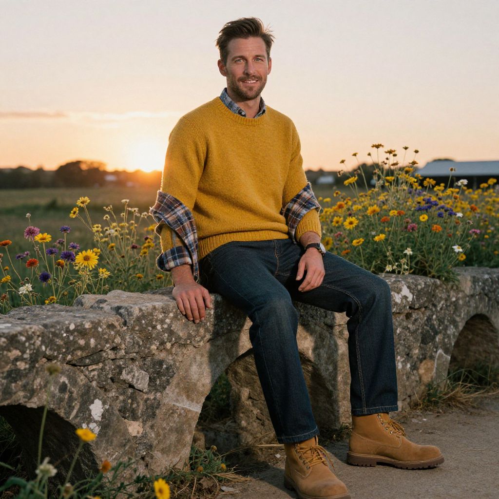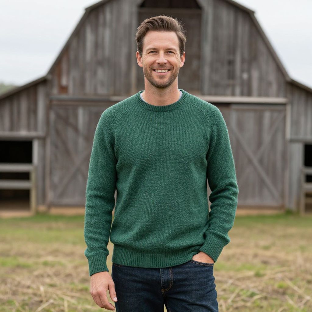 An artistic portrait of a smiling man dressed in a casual green sweater standing in front of a rustic barn and a field, showcasing a relaxed countryside lifestyle.