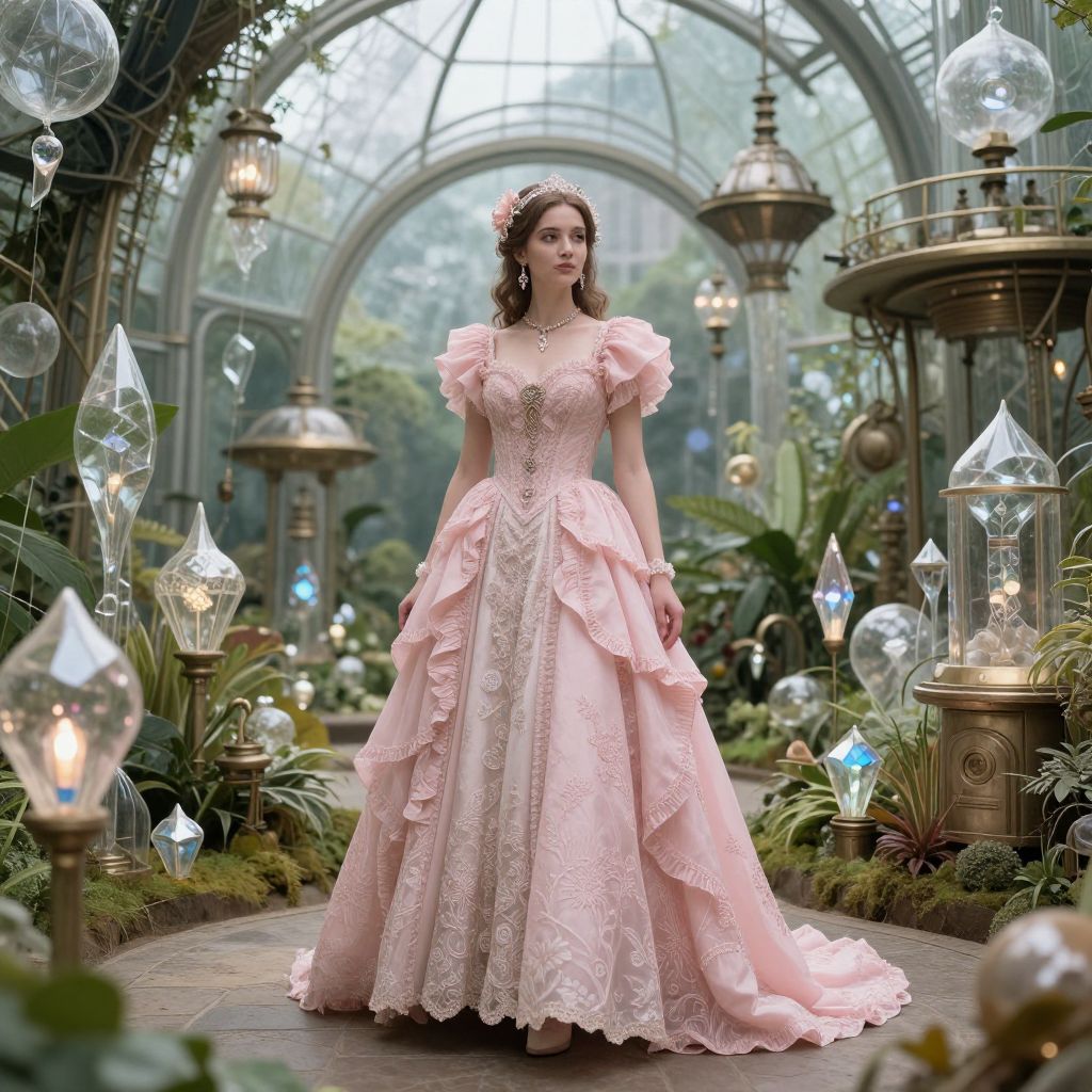 A woman in a intricately detailed pink dress stands in a futuristic steampunk botanical garden, surrounded by delicate glass and crystal decor.