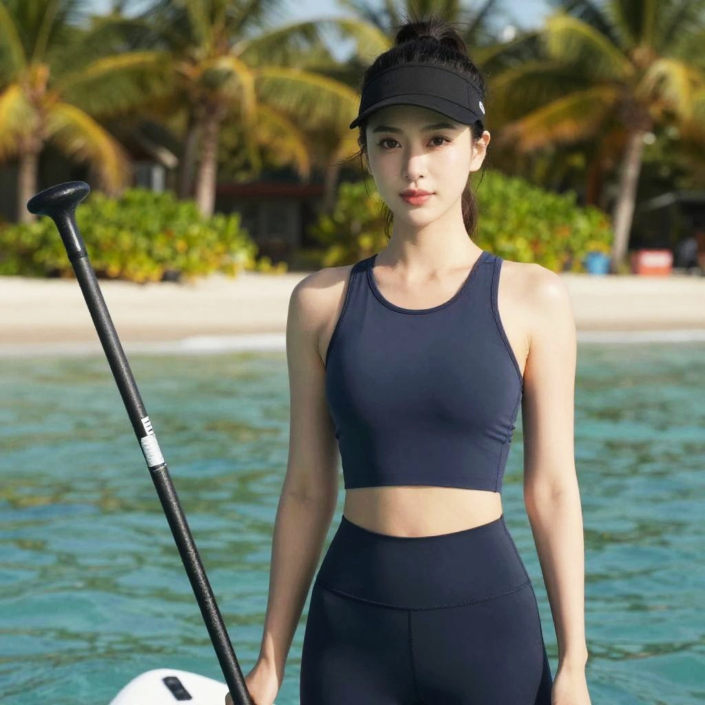 A woman, in an athletic leisure outfit with a cropped tank top and high-waisted leggings, wearing a black visor cap, at a tropical island paddleboarding lagoon, in a vibrant wit studio style. Sexy. Pretty face and beutiful eyes