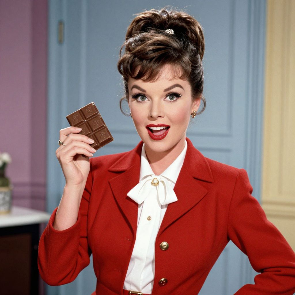 Photograph of a smiling white woman with fair skin and dark brown, wavy hair, wearing a white cowboy hat and a blue plaid shirt. She is kneeling in a field of ripe, red tomatoes, with her hands resting on the tomatoes. The background is a clear blue sky, and the field stretches out in the distance. The woman has red lipstick and a cheerful expression, with her blue eyes looking directly at the camera. The image has a bright, vibrant color palette and a slightly retro, 1950s-style aesthetic.