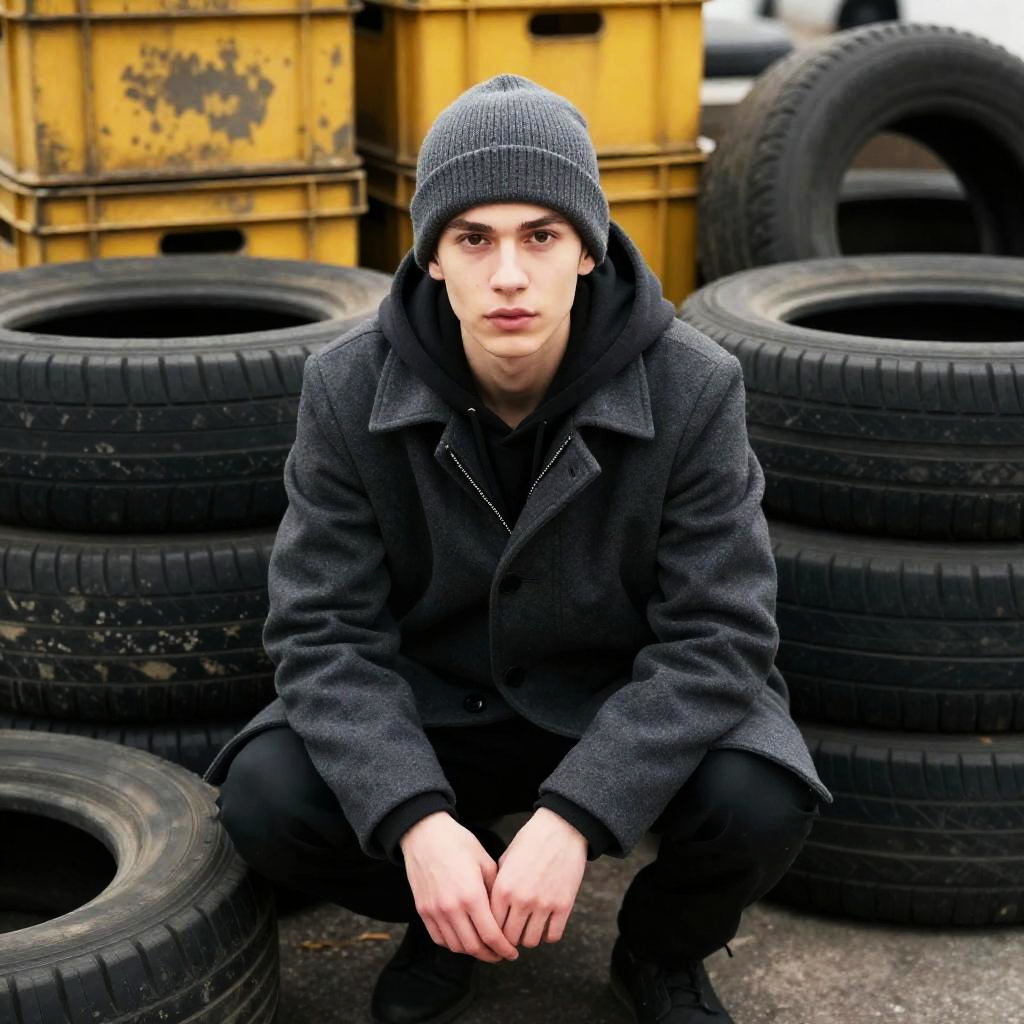 Young man with fair skin, brown eyes, and slim build, wearing a dark gray hooded coat and gray knit beanie, kneeling in front of a pile of stacked, worn-out black tires. He has his hands clasped together and looks directly at the camera with a focused expression. Background includes yellowish, weathered crates and more tires. Overcast lighting.