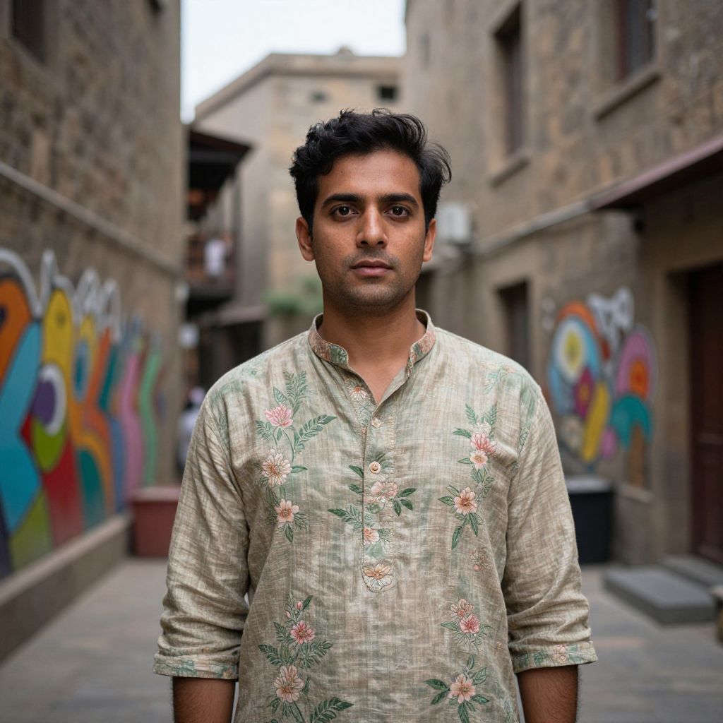 A man, Mekhela Sador in earthy green, floral designs, linen kurta in beige, modern yet traditional look, historic stone buildings juxtaposed, vibrant street art, shadowed alleyways between giants, Holga camera style, soft focus, contemplative expression. Man has masculine face and piercing eyes