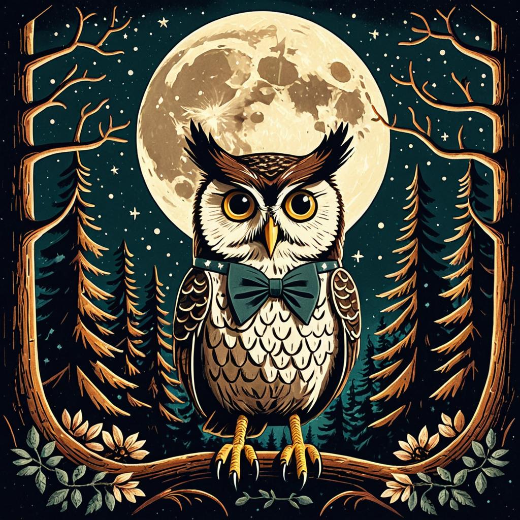 Lowbrow art of a humorous owl with a bow tie, influenced by Jim Flora, with an animated nighttime forest with oversized moon, warm tones, playful vibe, vintage Americana feel