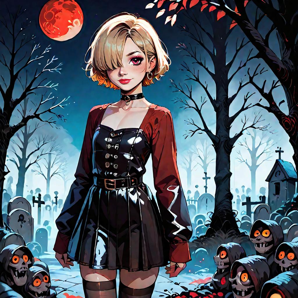 Score_9, score_8_up, score_7_up, source_anime, pinup of 1girl, solo, horror \(theme\), mysterious, standing at graveyard, smile, glowing eyes, outdoors, night, red moon, crowd, tree, short hair, blonde hair, hair over one eye, brown eyes, flat chest, small breasts, jaket, long sleeves, sleeves past fingers, skirt, thighhighs, leather choker, detailed eyes, eye reflection