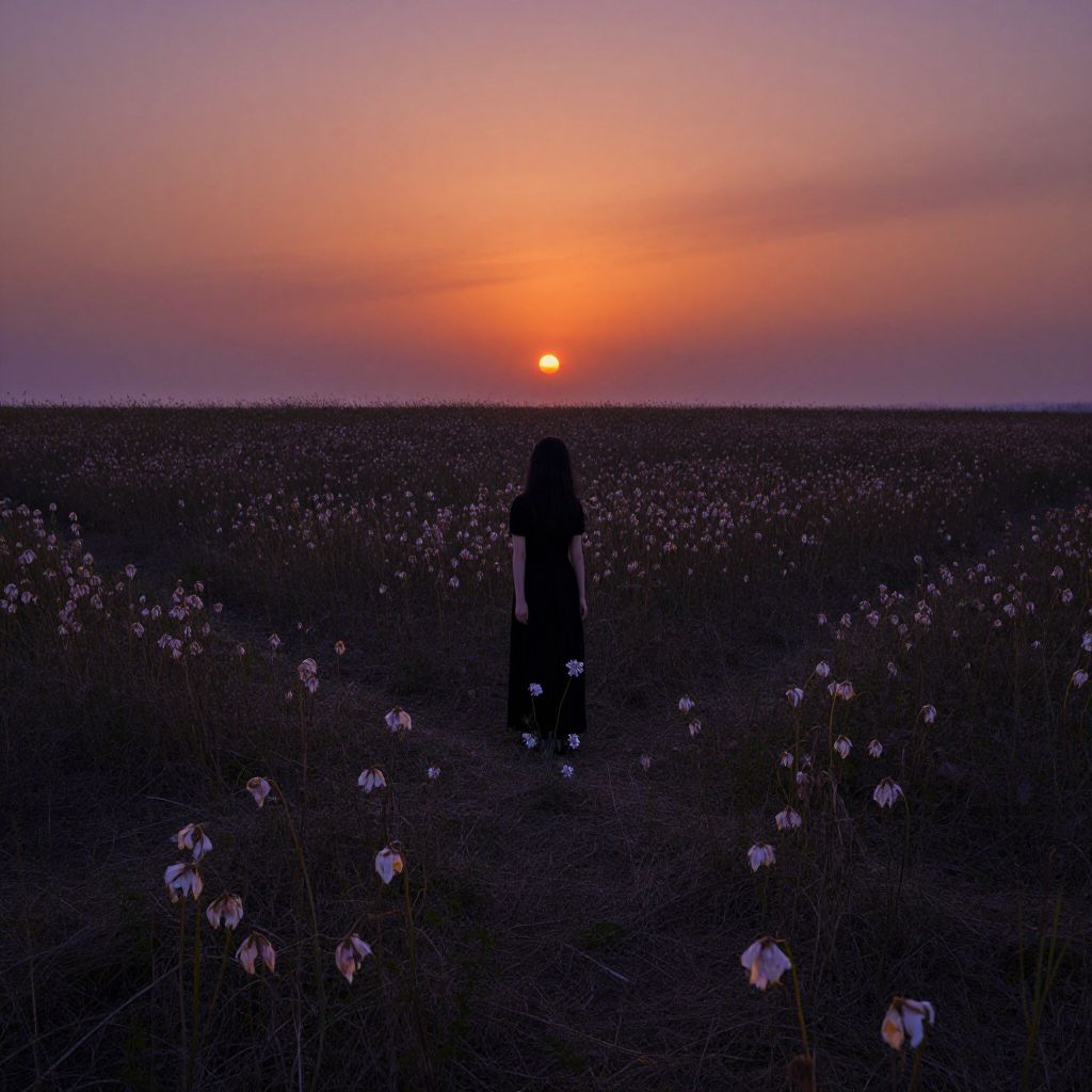 Imagine a somber scene of a lone figure standing amidst a field of wilted blossoms, encapsulated in an everlasting dusk. This ethereal woman appears contemplative, her silhouette contrasting the receding skyline where vibrant oranges meet deep purples. Captured from above to display both her grandeur and solitude, she stands at the crossroads of reality and reverie. The image should stir feelings of isolation and introspection, as if caught in a moment betwixt wakefulness and dreams. Blend impressionism's dreamy color scheme with photorealism's intricate details to create an emotionally rich canvas that lingers in the viewer's mind, as though they've witnessed this ephemeral instant frozen in time.