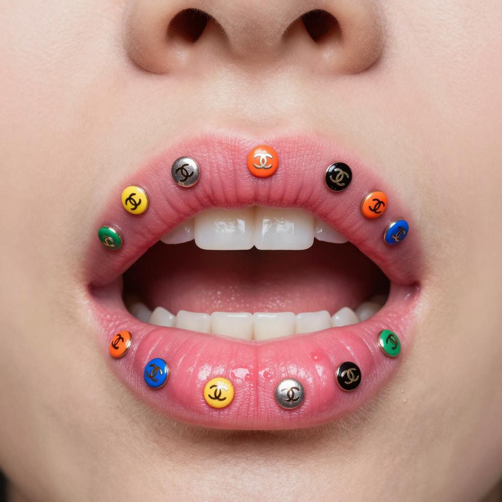 Close-up photograph of lips with bright pink lipstick. Lips covered in small, metallic Chanel charms in yellow, orange, green, and black. Teeth visible in the center, painted blue. Background is skin. Lips slightly parted. Charms evenly spaced across upper and lower lips.
