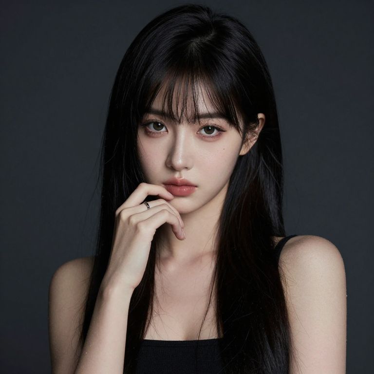 Photograph of an East Asian woman with long, straight black hair and bangs, gazing directly at the camera with a neutral expression. She has fair skin, delicate features, and light brown eyes. Her right hand is raised to her chin, resting on her lower lip, with a simple silver ring on her index finger. She is wearing a black sleeveless top. The background is a solid, dark blue-gray color, creating a stark contrast with her pale skin and black hair. The lighting is soft, highlighting her face and hand, while casting gentle shadows on her shoulders.