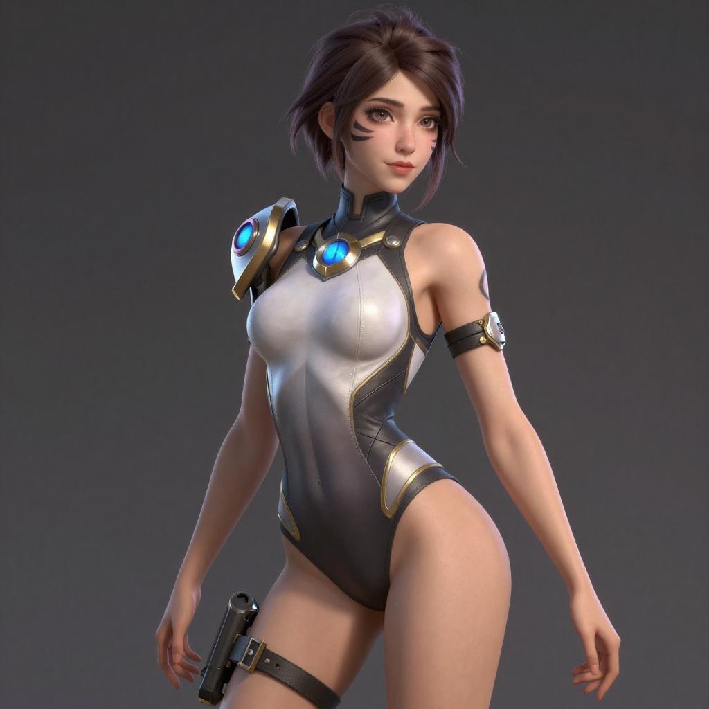 Digital artwork of a young woman with long brown hair and brown eyes wearing a futuristic blue and pink pilot bodysuit. She has facial whisker markings and is equipped with headphones and white gloves. The sleek, skin-tight suit features a bunny emblem on the chest and armored accents. The character is portrayed in a cowboy shot pose against a simple grey background.