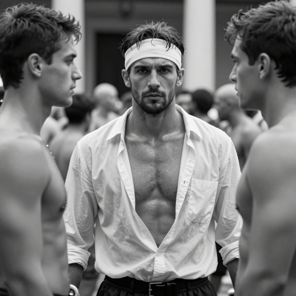 Black-and-white photograph of a muscular man with a headband, wearing a wet, open shirt, standing between two shirtless men. Background includes a blurred crowd and architectural columns. Man in center has intense expression, others look at him.
