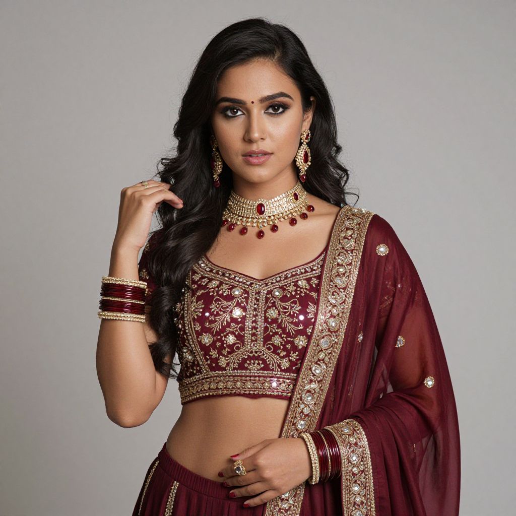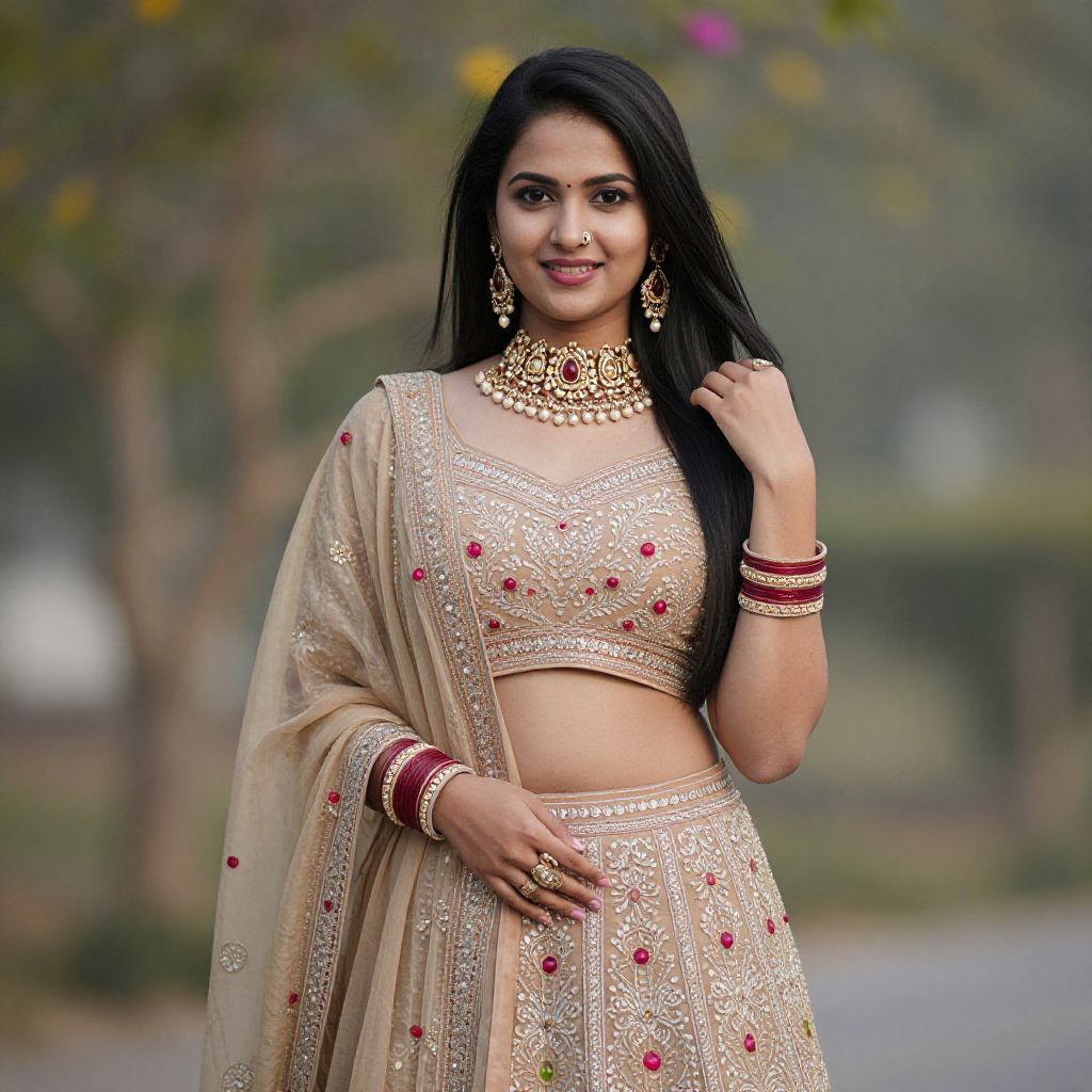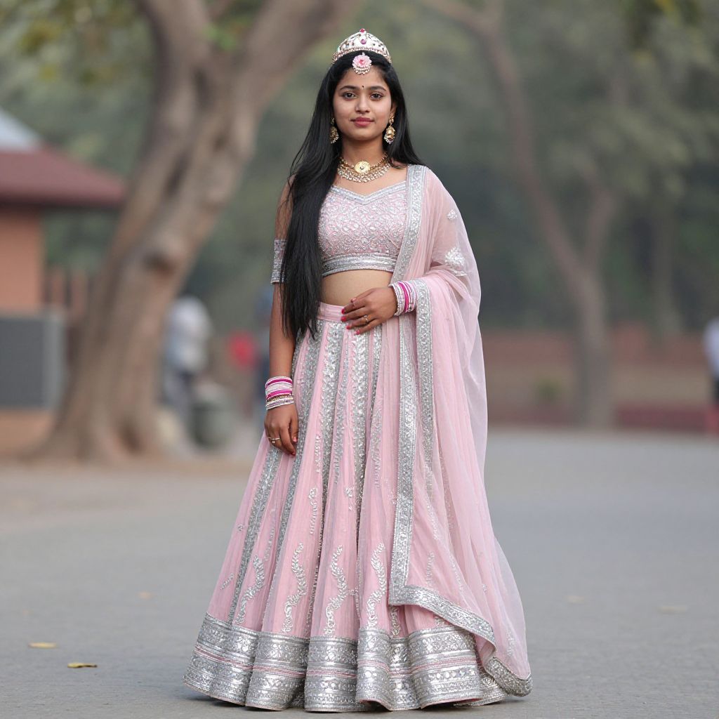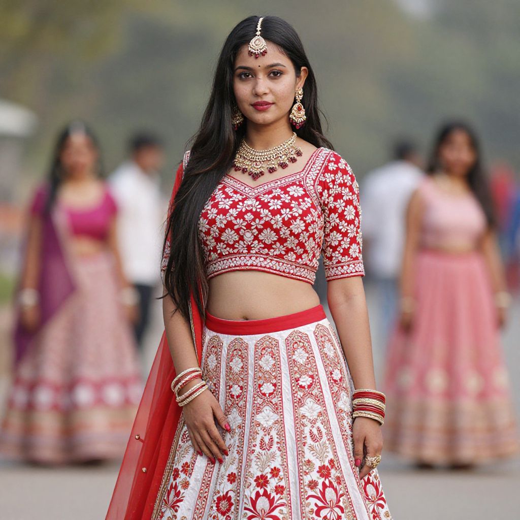 Red white lehenga choli, 1girl, solo, jewelry, long hair, earrings, black hair, freckles, dress, flower, blurry, looking at viewer, pink dress, blurry background, bracelet, lipstick