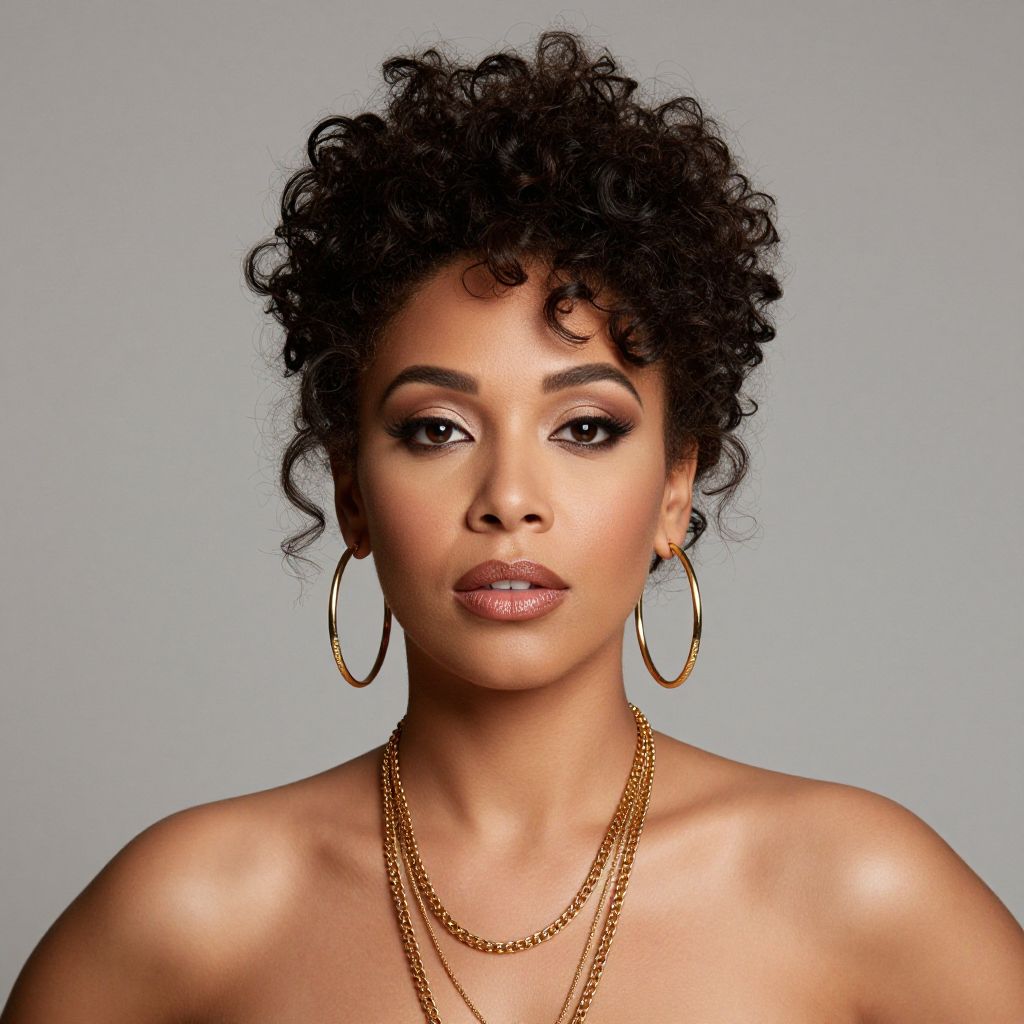 Elegant woman wearing gold hoop earrings and layered necklaces, complemented by voluminous curly hair styled upwards, exuding a glamorous and sophisticated look reminiscent of Josephine Baker's iconic style.