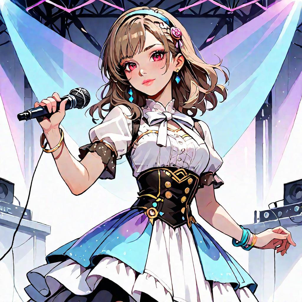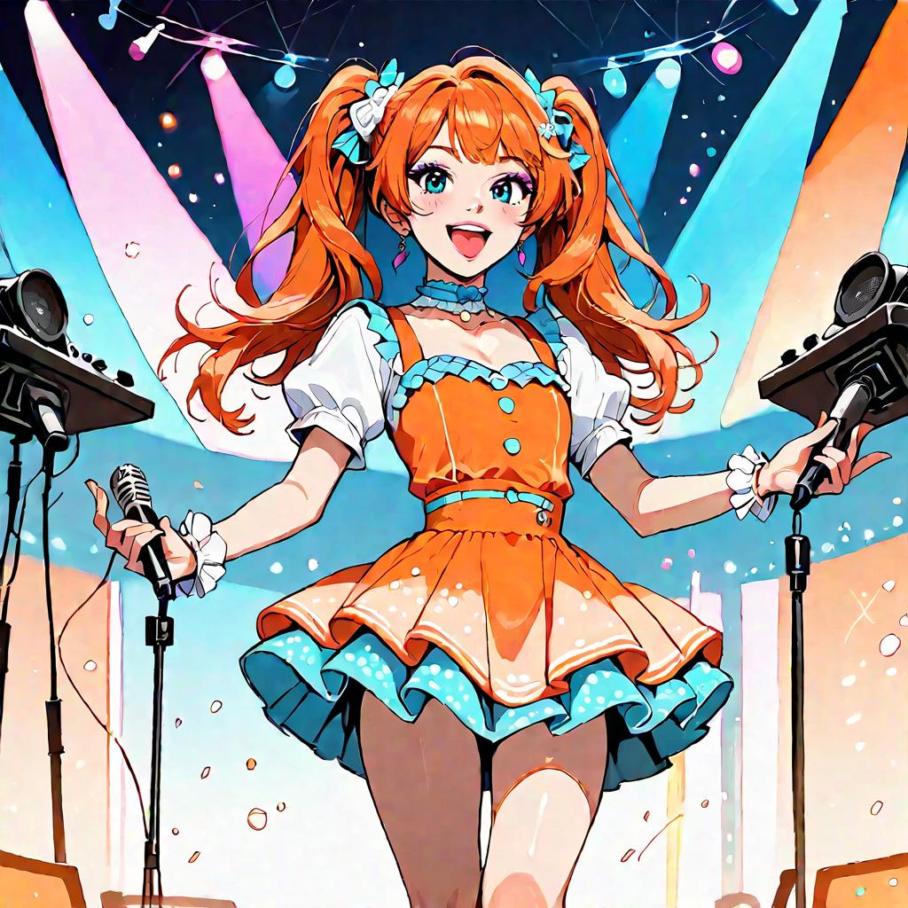 Score_9, score_8_up, score_7_up, source_anime, pinup of 1girl, solo, idol concert, singing on stage, cheerful, smile, open mouth, microphone, orange theme, stage lights, white pillar, multicolored neon, large television, glint, light particles, long hair, orange hair, twintails, bangs, aqua eyes, hair ornament, flat chest, small breasts, idol clothes, orange dress, short sleeves, white frills, frilled wristband, skirt, thighs, jewelry, choker
