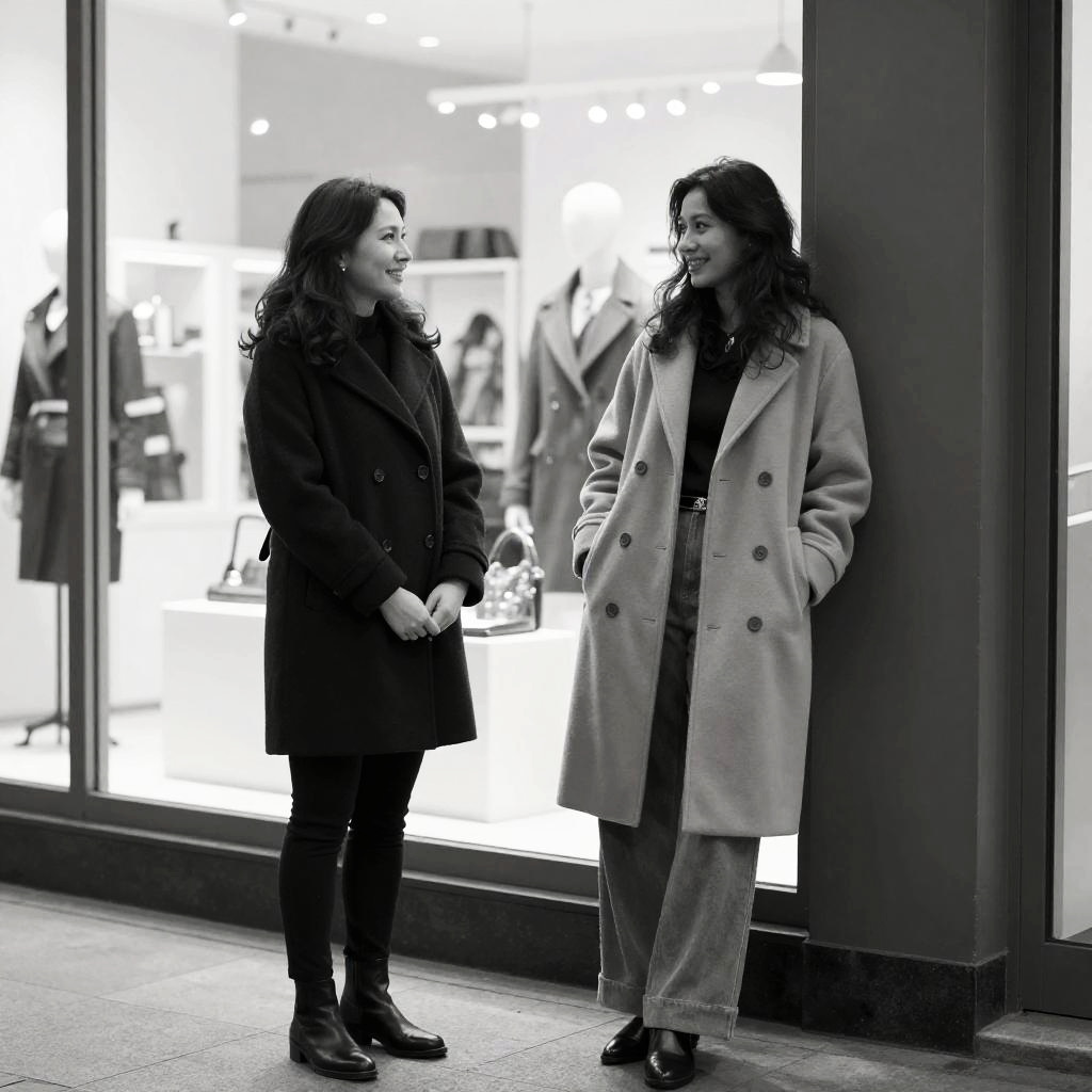 Black-and-white photograph of two women standing on a city sidewalk in front of a brightly lit storefront. The woman on the left has wavy dark hair, wears a dark coat, black pants, and boots, and stands facing the other woman with a smile. The woman on the right leans against the store wall, with wavy dark hair, wearing a light-colored, double-breasted coat, dark top, and light-washed pants, with hands in pockets. The background features a window display with blurred mannequins and clothing. Both women are engaged in conversation, exuding a casual, friendly atmosphere.