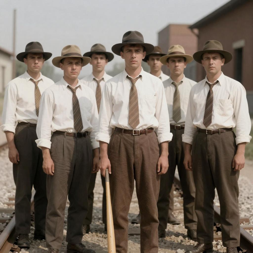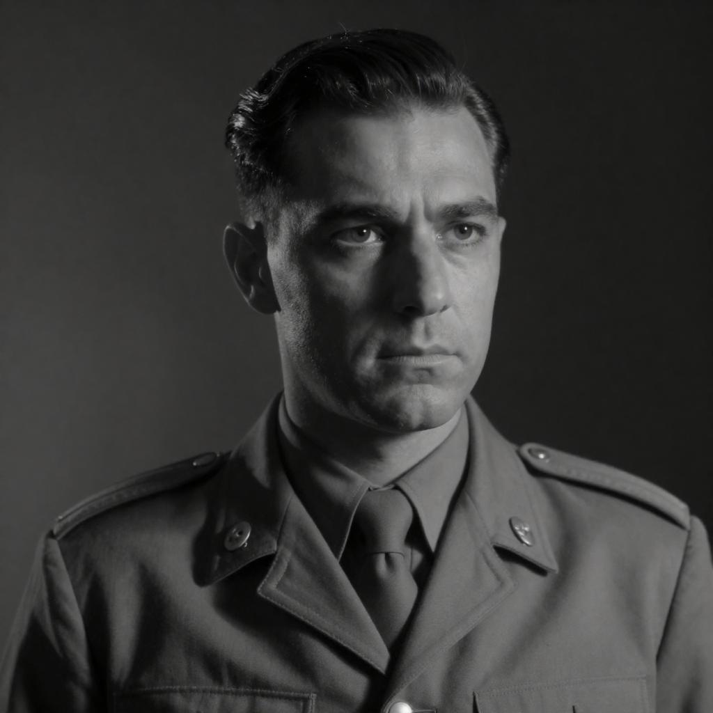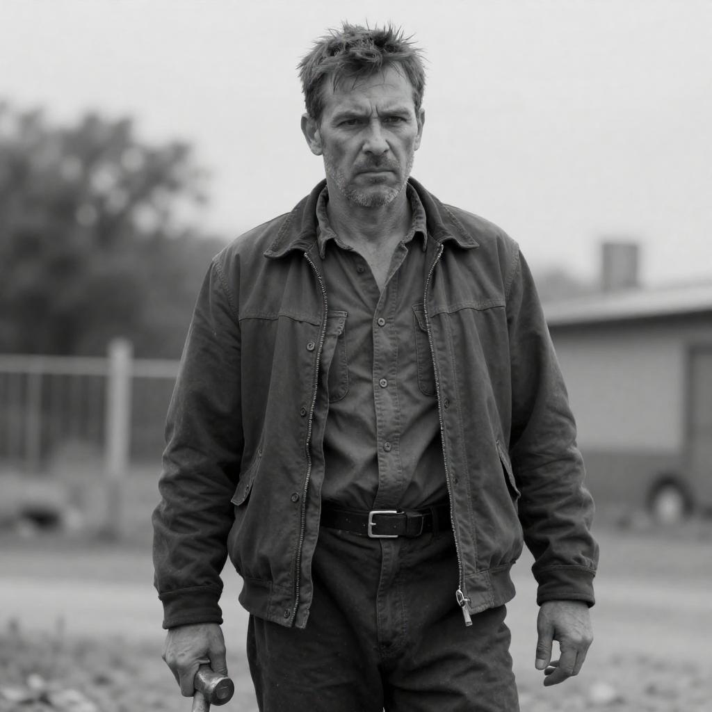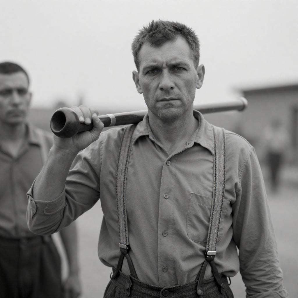 Black-and-white photograph of a rugged, middle-aged man with short, dark hair, wearing a button-up shirt and suspenders, holding a large, ured pipe over his right shoulder. Another person, partially visible, stands to his left. The man's expression is serious, and the background is blurred.