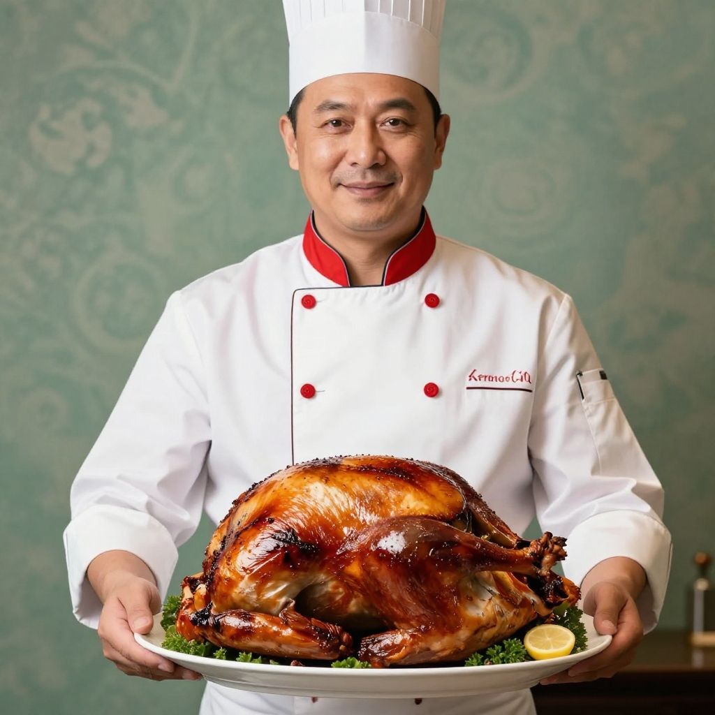 A confident chef presents a beautifully plated roasted turkey, showcasing his culinary skills. Dressed in a traditional white chef's jacket with red accents, he stands out against a soft green patterned background, epitomizing a warm and inviting culinary atmosphere.