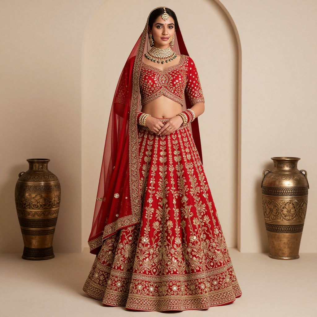 Elegantly poised woman wearing a vibrant red bridal lehenga adorned with intricate gold floral motifs and embellishments, complemented by a matching dupatta and traditional jewelry, set against a minimalist backdrop with two decorative vases flanking her sides.