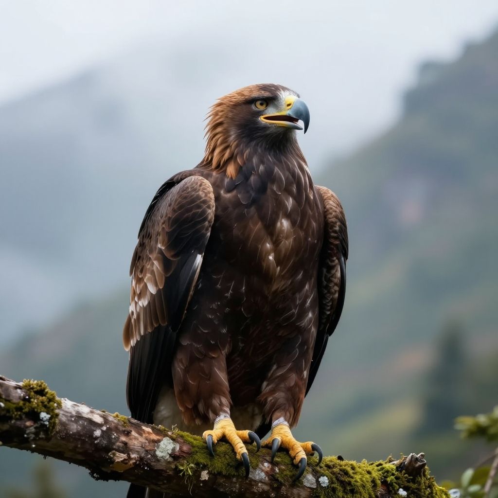 Smiling eagle close-up with a wide beak grin, vivid plumage texture, sitting on a mossy tree branch in a misty mountain landscape, soft focus background, cinematic wildlife shot