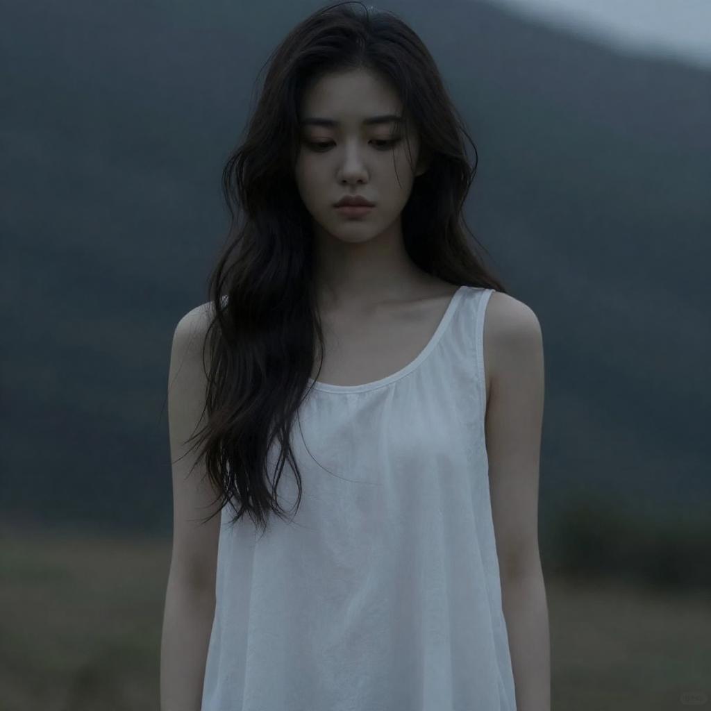 Photograph of a young woman with wet, dark, tousled hair, gazing through a foggy, ured glass window. Her expression is neutral, and she is partially illuminated by bright light behind her. A blurred silhouette of another person is in the foreground on the left.