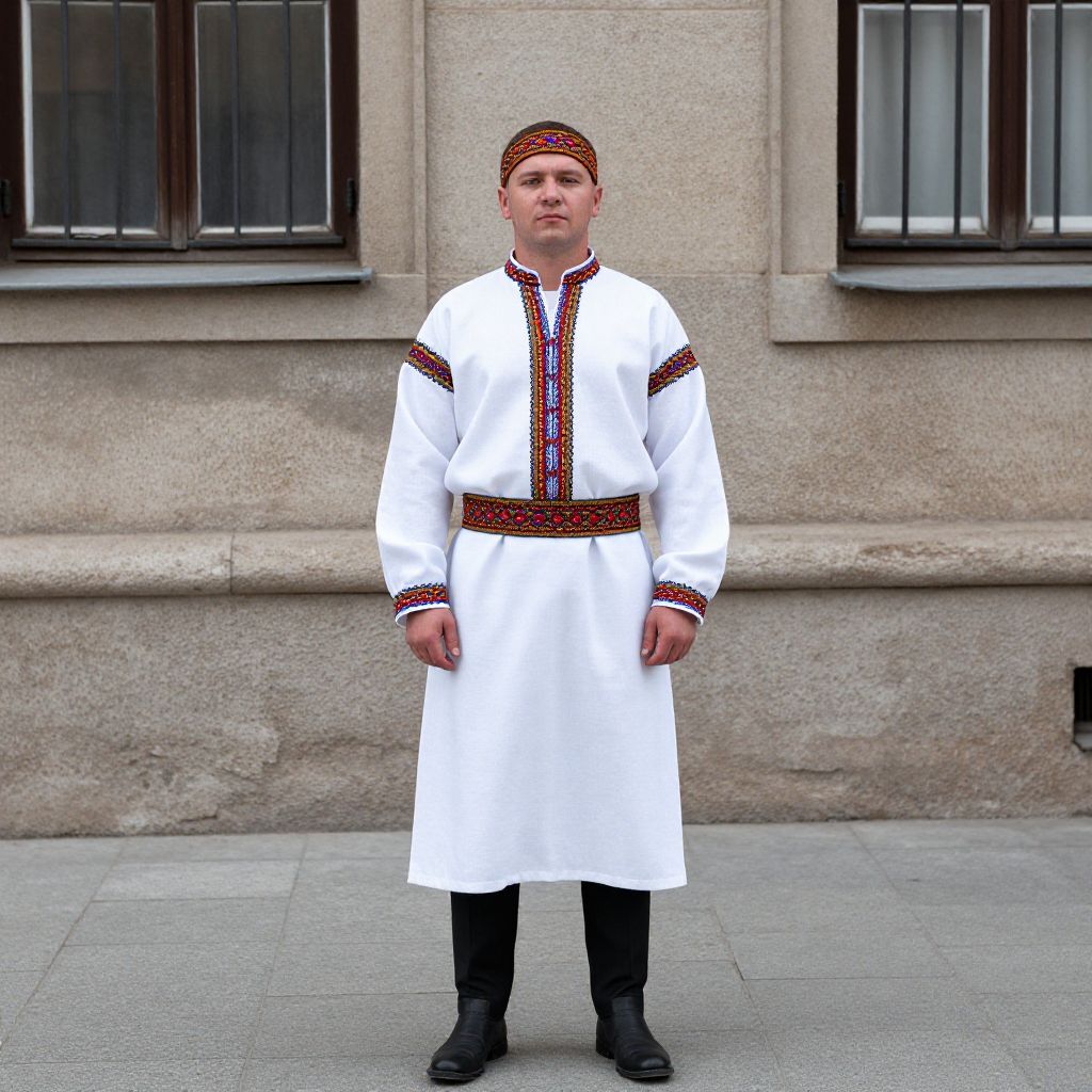 Russian National Costume Male, man in a traditional costume standing in front of a stone building