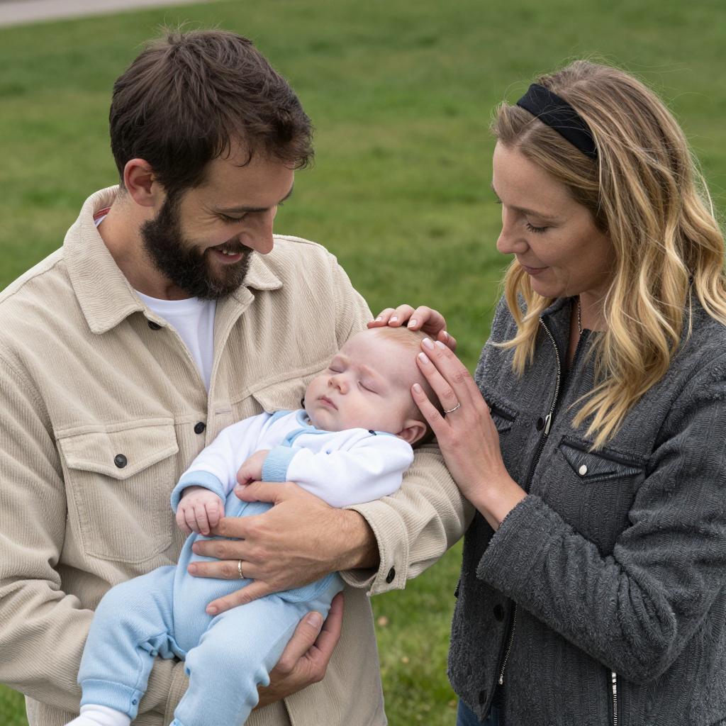 Black and white photograph of a smiling woman with short, wavy hair holding a curly-haired baby, standing next to a man with glasses and short hair wearing a button-up shirt. Man looks slightly to the right, woman looks down at baby. Background includes a window with vertical blinds.